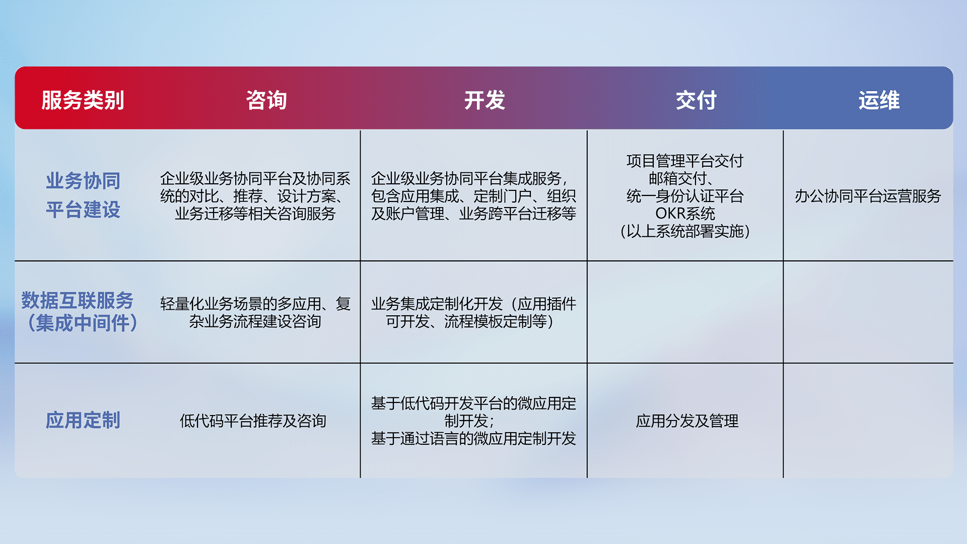 针对钉钉、、、、企微、、、、IDaas等平台级产品提供产品的规划、、方案、、、交付、、定制化开发等服务,,,实现如统一协同办公、、智能客户服务、、混合会议管理、、智能数据查询、、、等业务场景,,,,实现数字化转型。。。